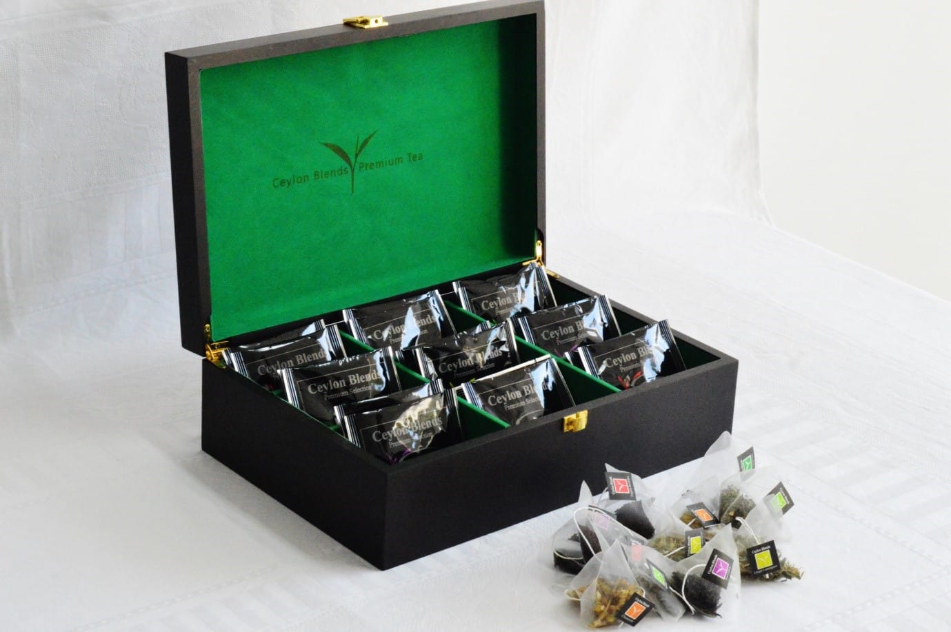 Our uniquely crafted Ceylon Blends wooden Tea chests come with a selection of Pure Ceylon Black, Green and Herbal Teas packed in Pyramid pouches. This makes a fabulous corporate or personal gift.